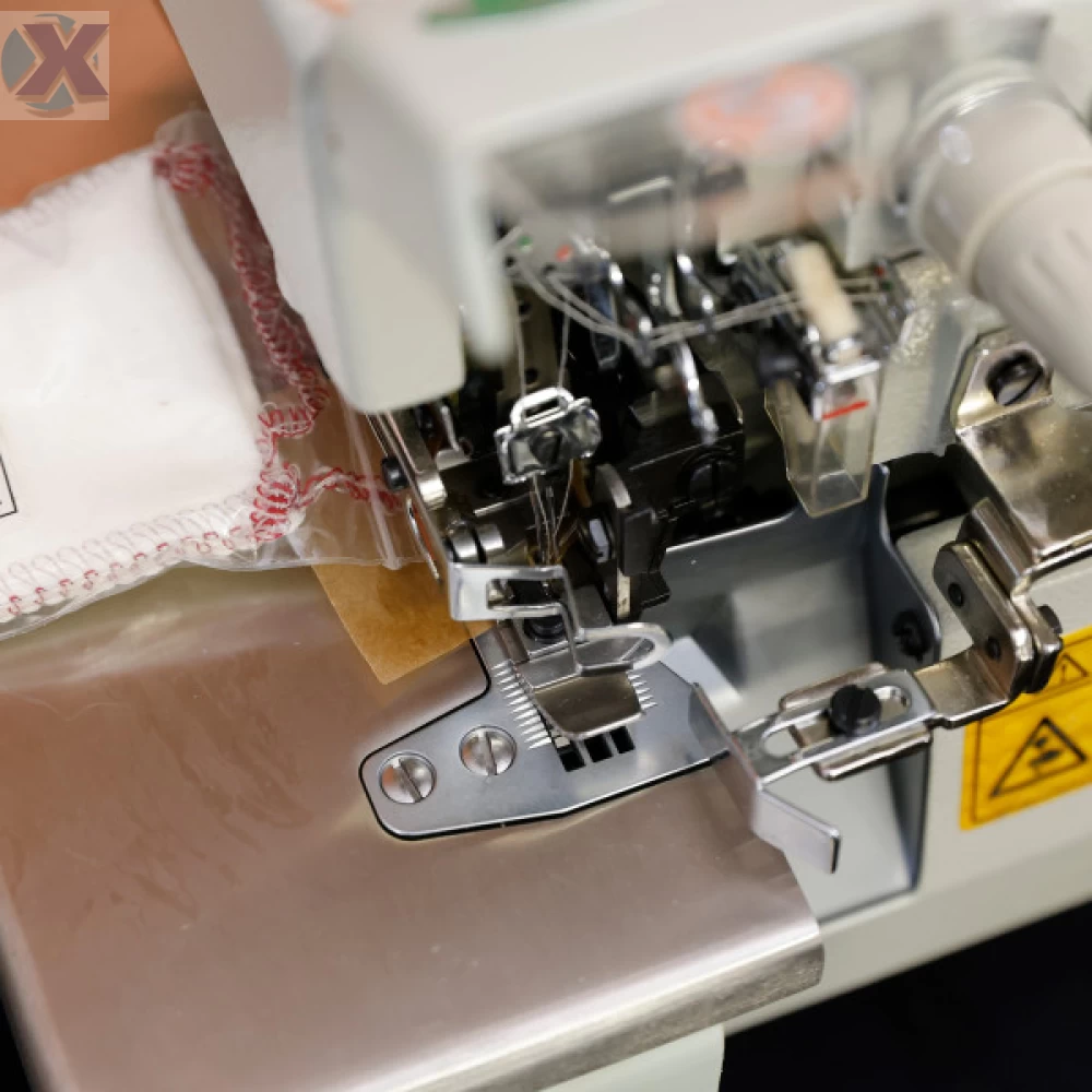 Máquina de costura industrial overlock para tecidos médios. Aplicação para pré-costura, aplicar elástico e viés.