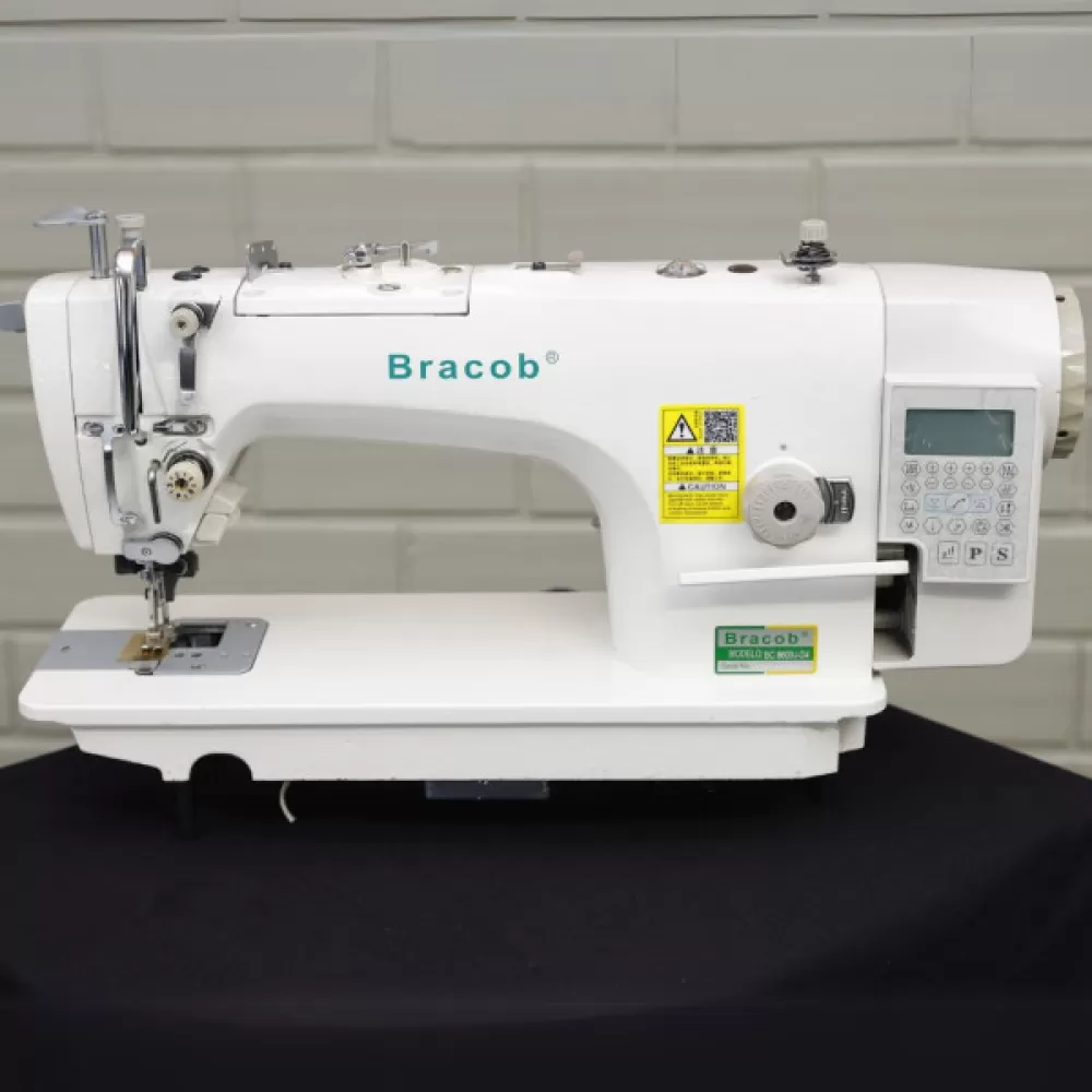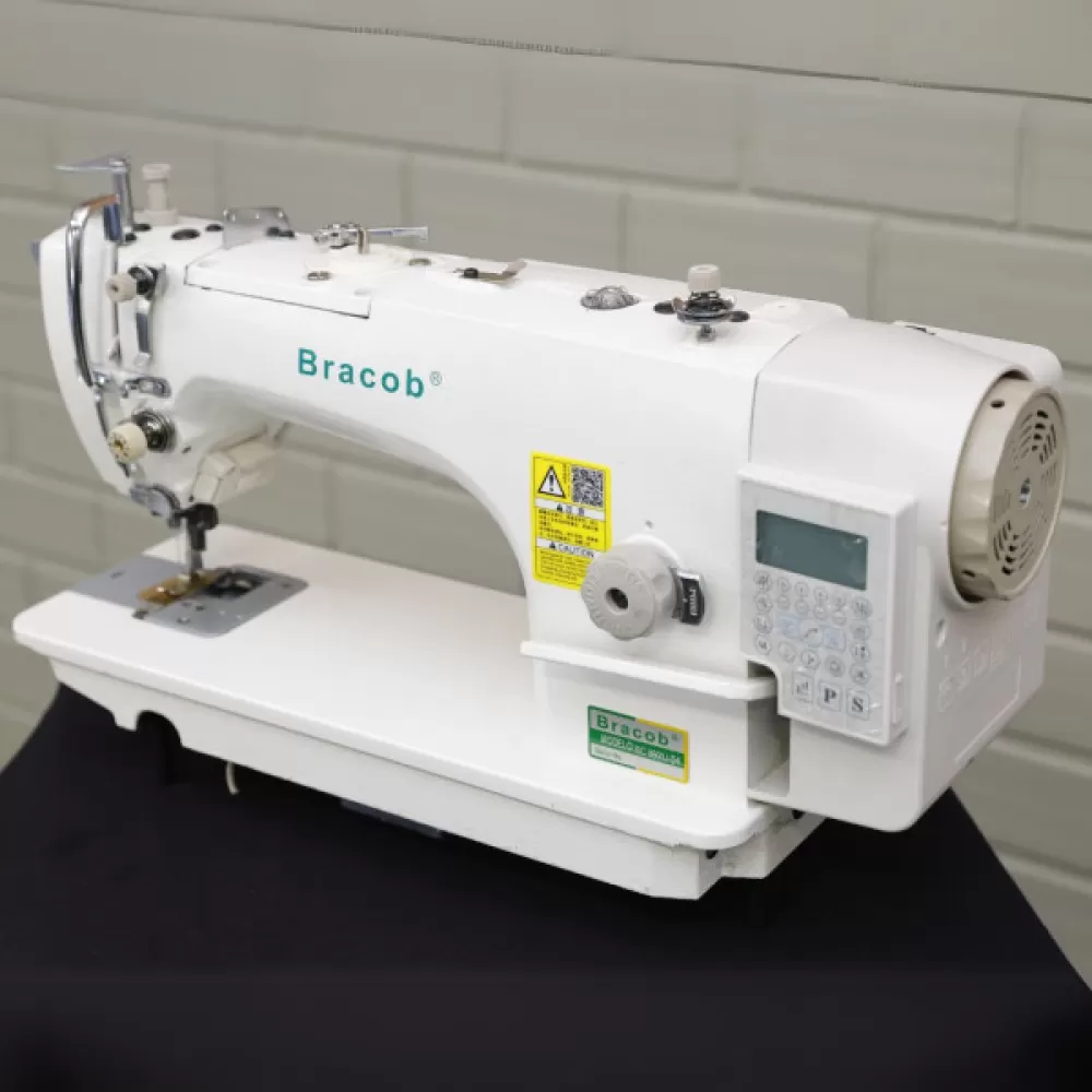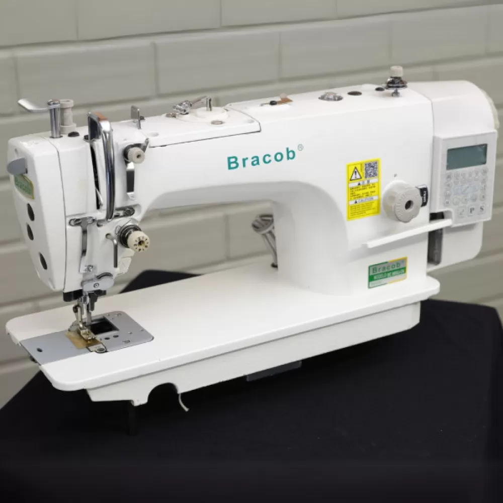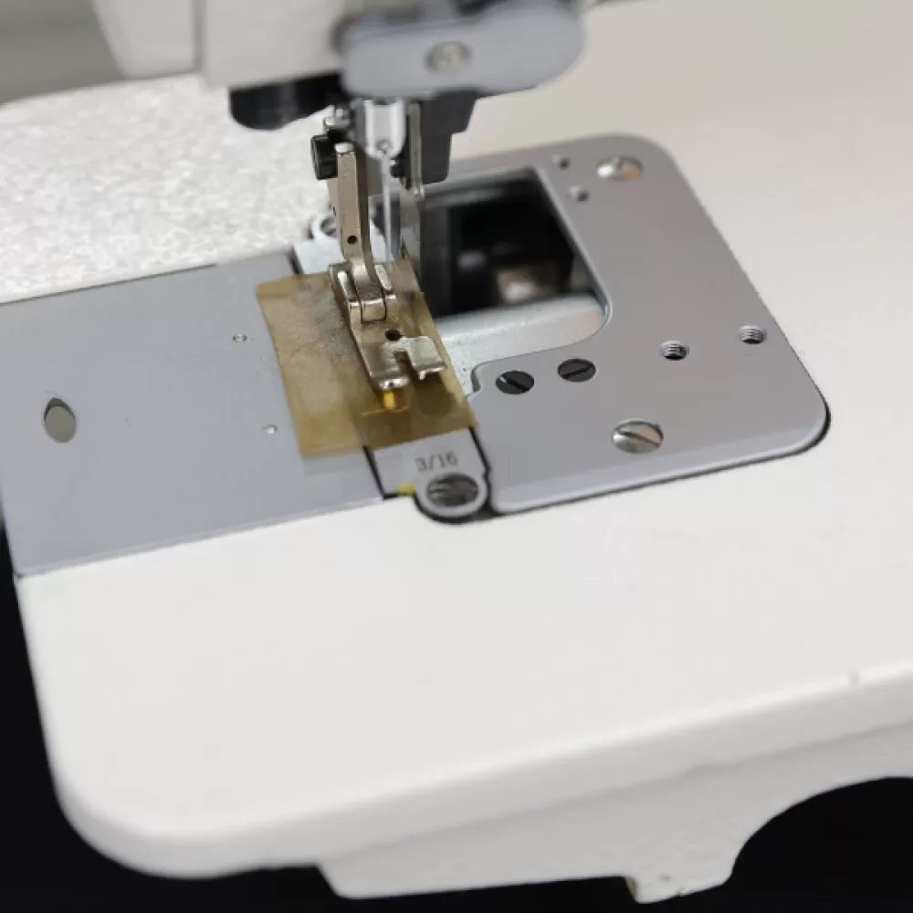 Máquina de costura industrial reta direct drive eletrônica com refilador (faca vertical), calcador e corte automático de fio. Aplicação: Usada para costurar todos os tipos de camisas, ternos e peças similares, golas e roupas em geral, etc. Seu sistema de faca refiladora pode ser desativada no meio de uma operação de costura.
