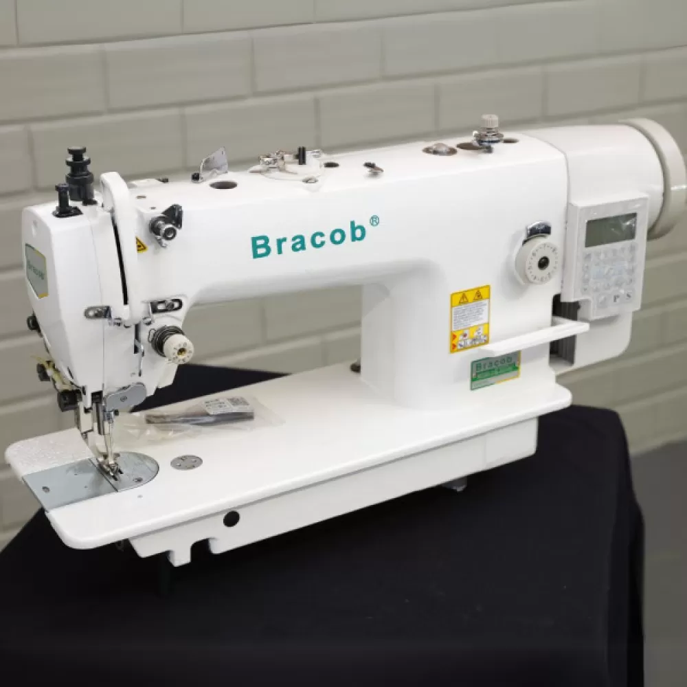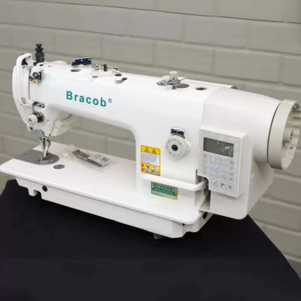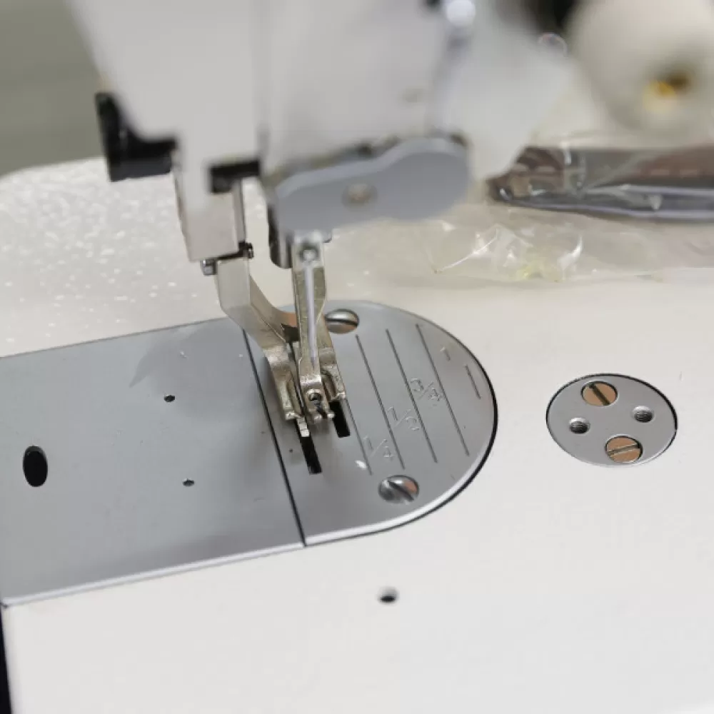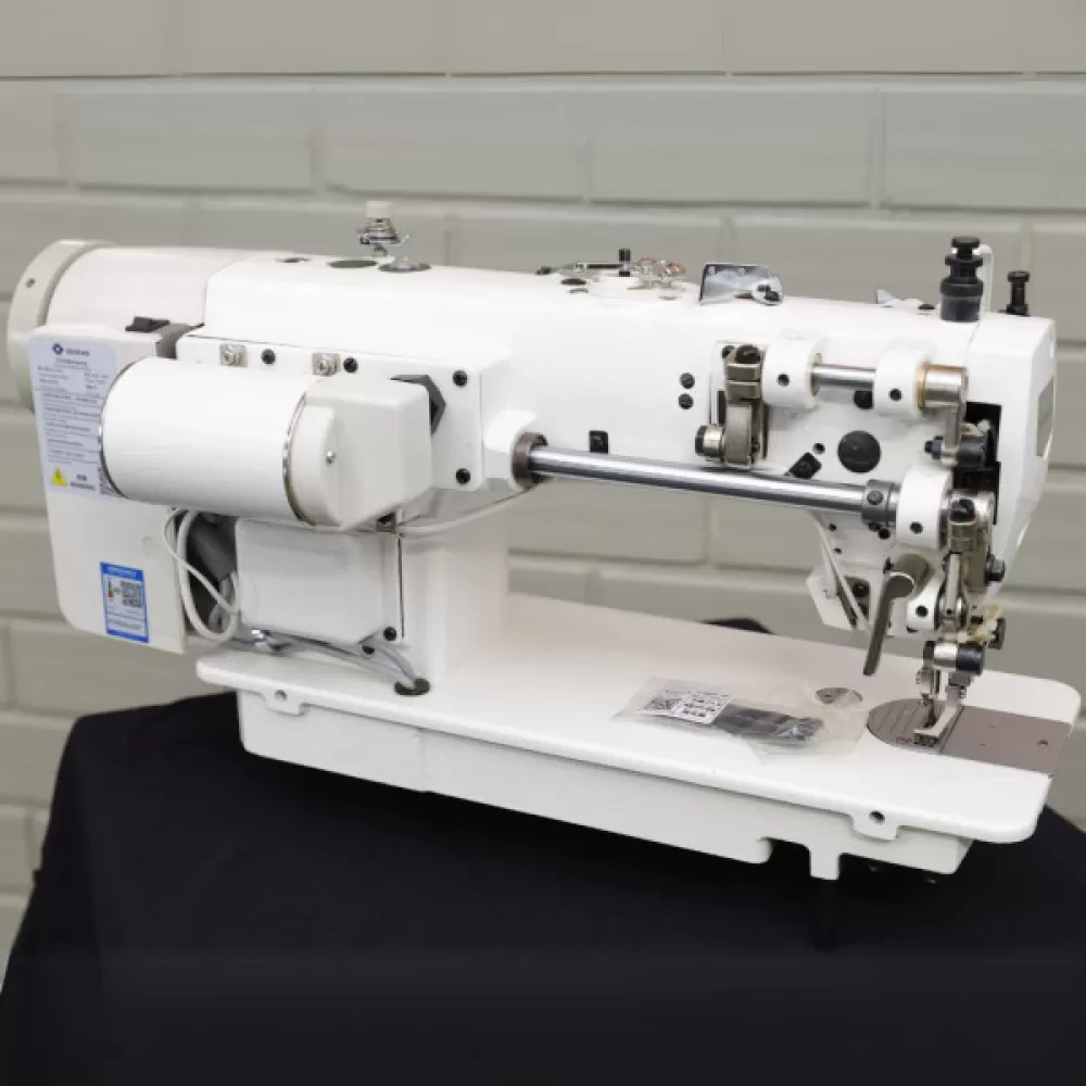 Máquina de costura industrial reta com transporte duplo (dente e calcador) eletrônica direct drive com posicionamento de agulha (parada de agulha), corte de fio automático e levantamento elétrico (solenóide) do calcador. Aplicação para tecidos médios a pesados (estofaria, jeans, napa, couro etc).