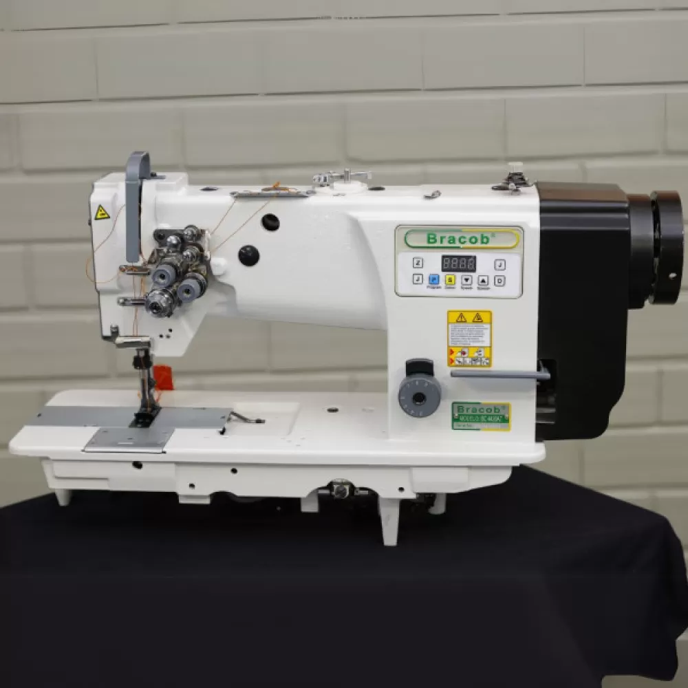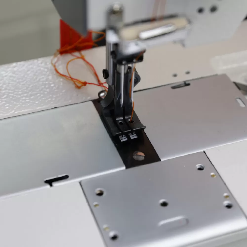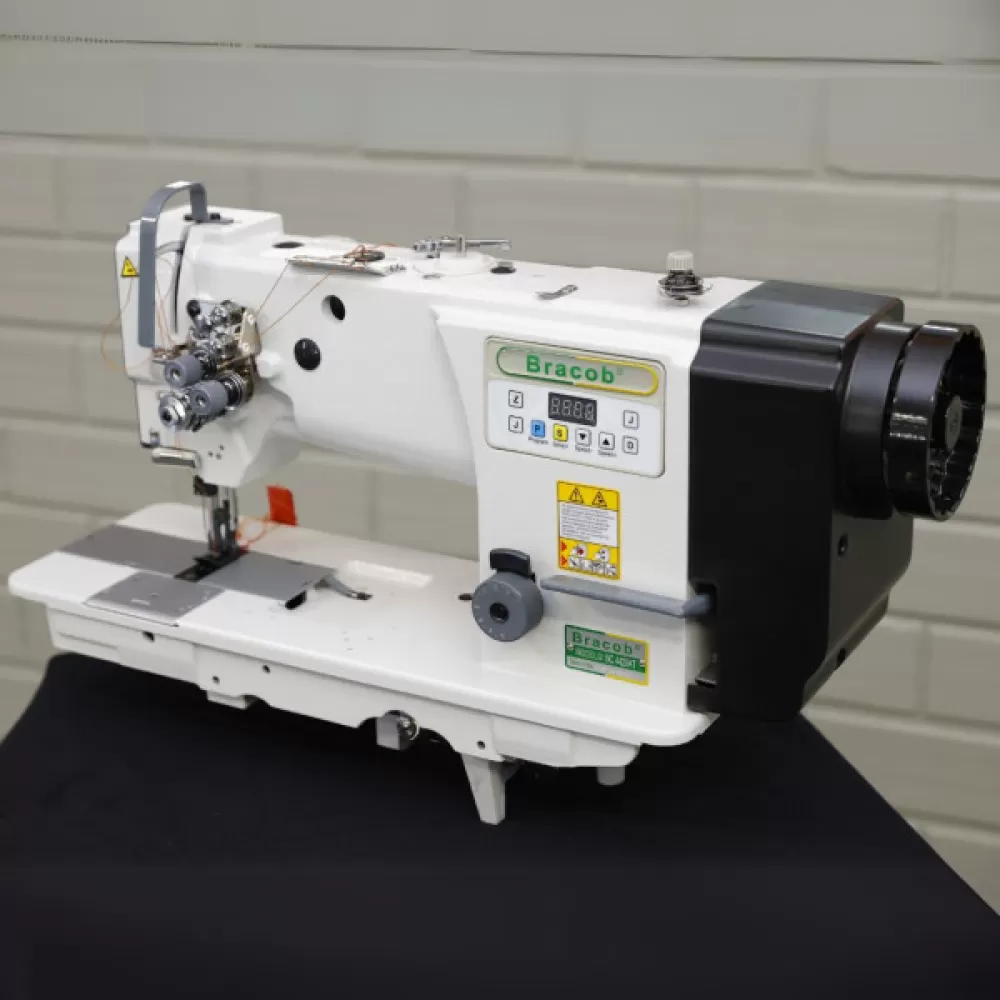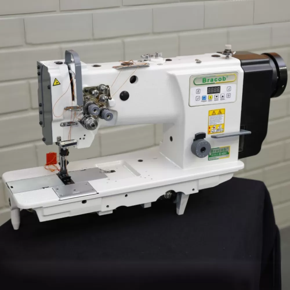 Máquina de costura reta industrial de 2 agulhas fixas direct drive com parada de agulha. Sistema transporte triplo (dente, agulha e calcador). Aplicação: para tecidos pesados (Estofaria, lonas, couro, etc). Possui lançadeira grande