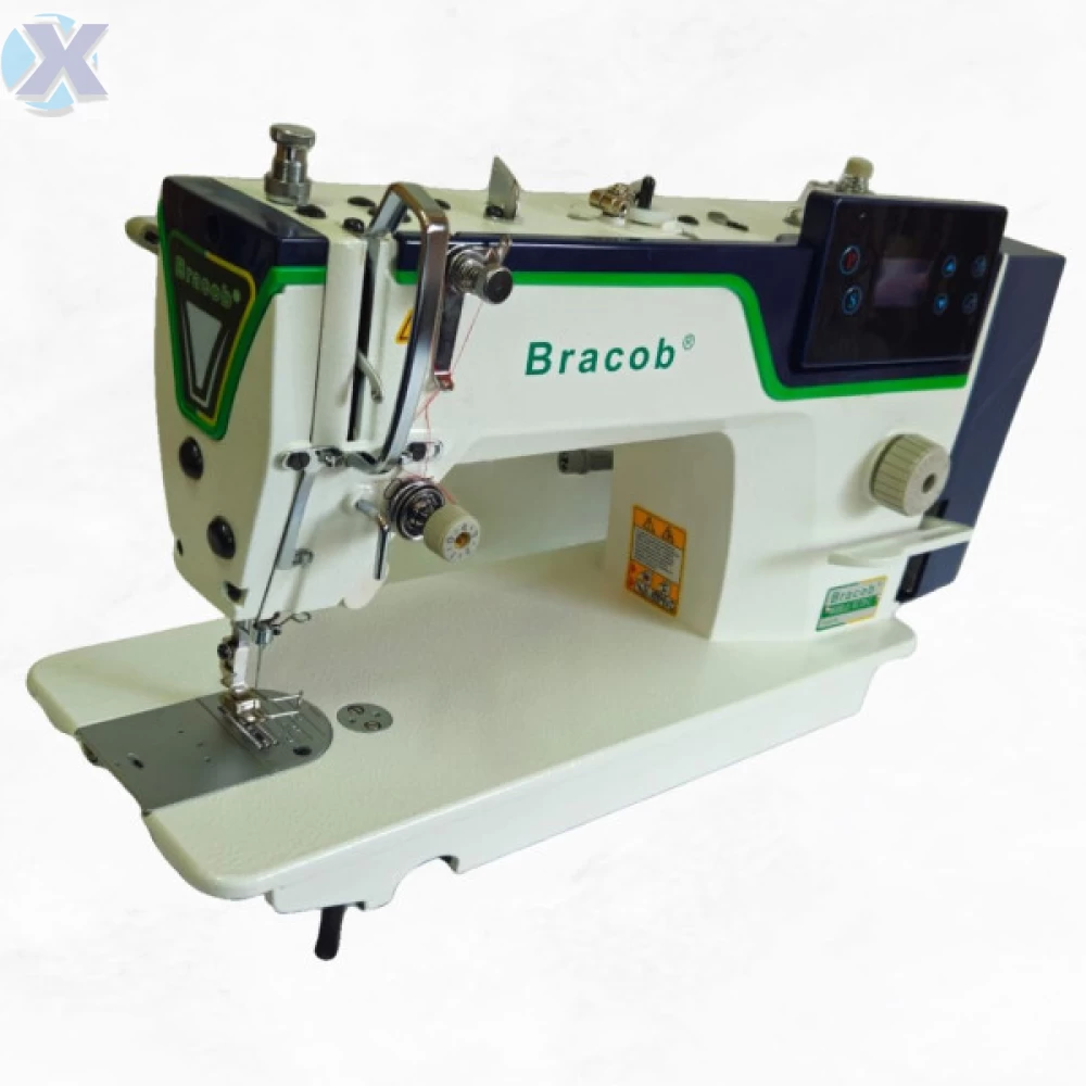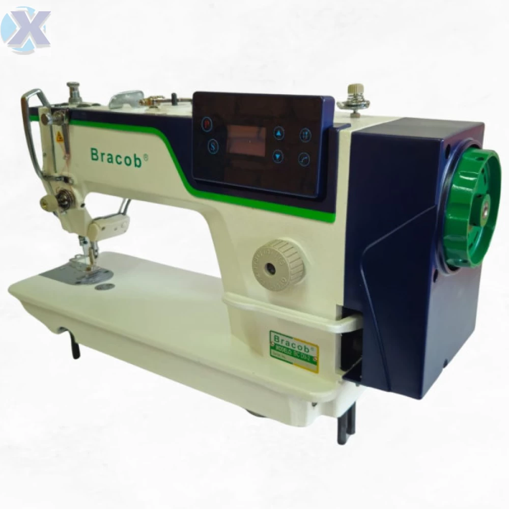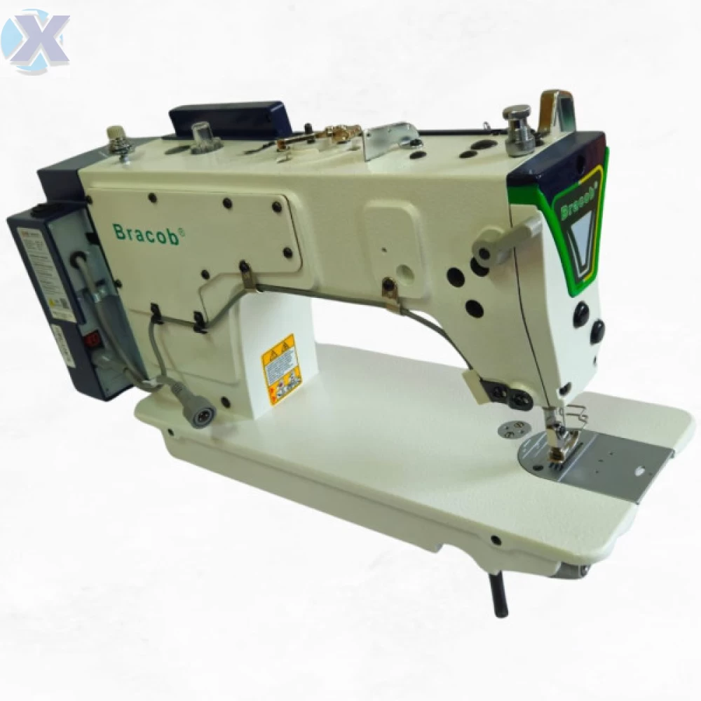 Máquina de costura industrial tipo reta eletrônica direct drive com motor de passo para arremate, tamanho de ponto e costuras programadas (9) de padrão. Possui posicionamento de agulha (parada de agulha) e corte de fio automático e levantamento de calcador automático através de solenoide.