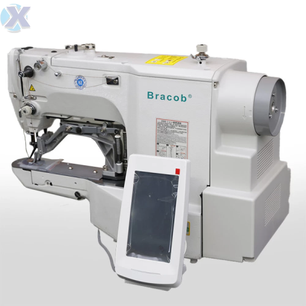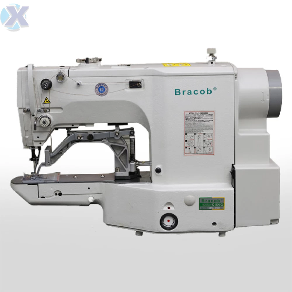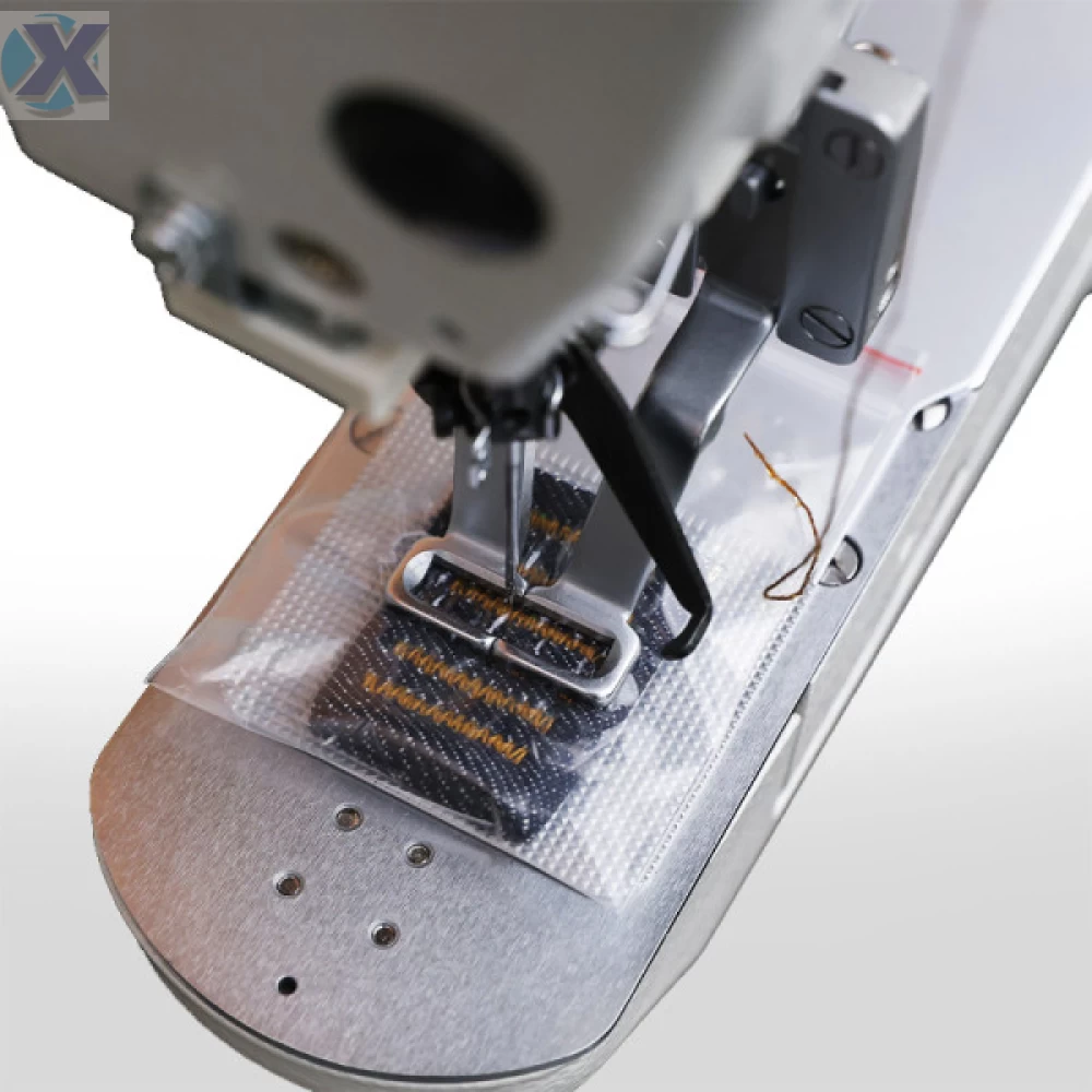 Máquina de costura industrial travete direct drive e eletrônica programável para tecidos médios a pesados. Aplicação pregar etiquetas , presilhas de calças, reforço de bolsos, etc. Acompanha calcador para ilhós.